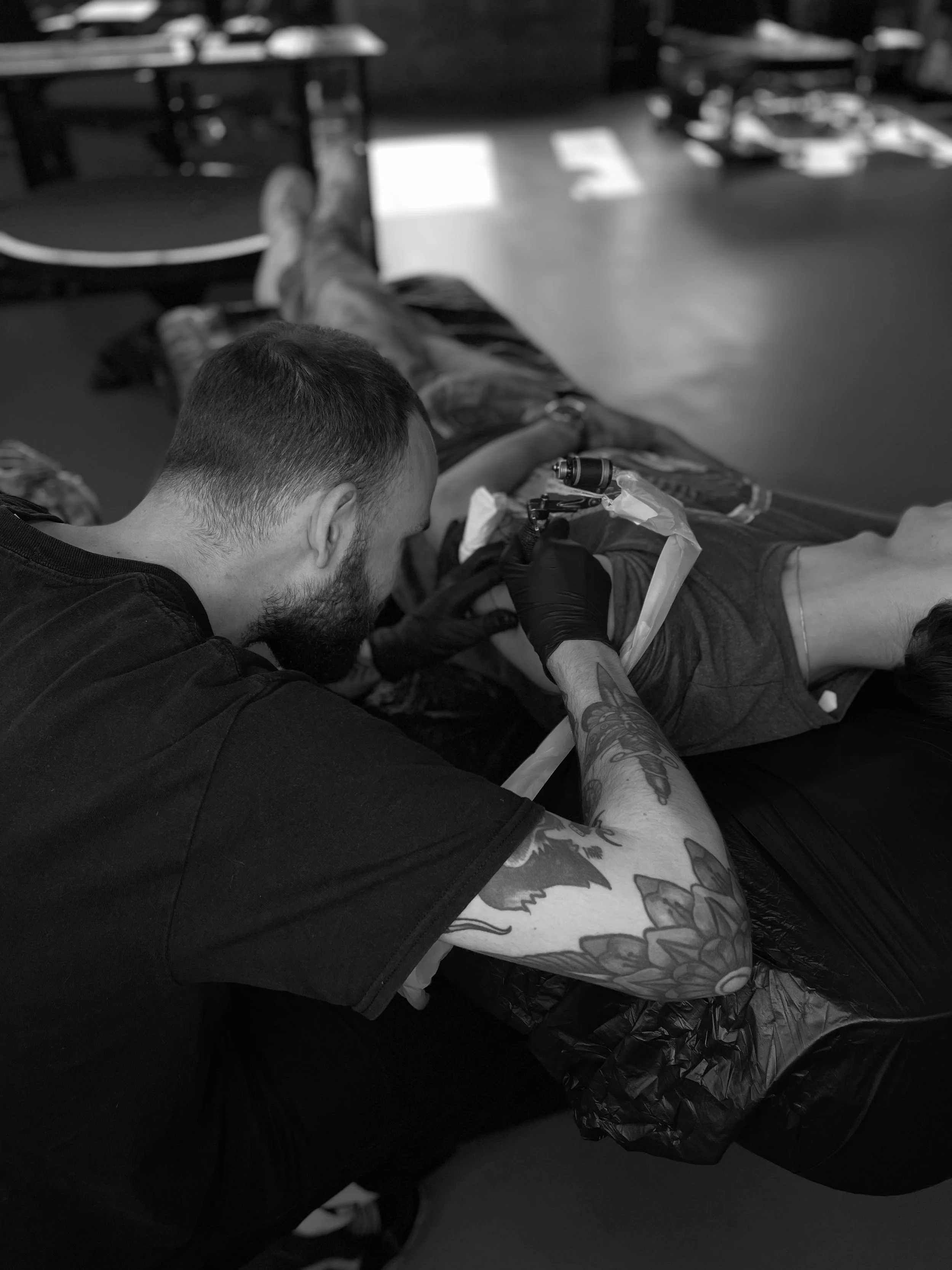 Een goede tattoo vereist een persoonlijke aanpak. Daarom begin ik met een vrijblijvende tekenafspraak. Dit doen we samen op de shop in Eindhoven, waar je persoonlijk het idee voor jouw tattoo kan toelichten. Dit helpt me om een duidelijk beeld te krijgen van je verwachtingen. Vervolgens deel ik mijn visie over hoe we daar een goede tattoo uit kunnen vormen. Ook kijken we naar de gewenste plaatsing. Het is belangrijk dat het lichaam en de tattoo elkaar complementeren. Ik let op de vormen en ritmes van het lichaam om te zorgen dat het ontwerp daar op aansluit. Ik maak een schets op papier of direct op het lichaam. Zo komen de grote lijnen tot stand, die ik op een later moment uitwerk tot een volledig ontwerp.